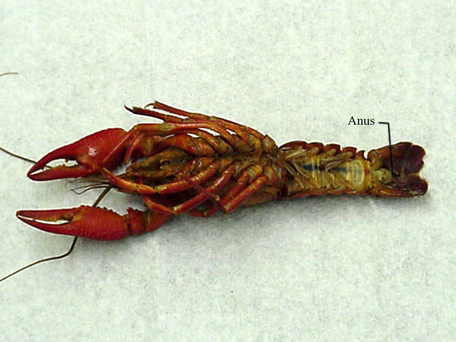 8. Abdomen - This section is a segmented tail. On the ventral side there are numerous swimmerets. The first pair is modified for the transfer of sperm in those that are ready to mate. Identify the uropod and the telson at the posterior end of the abdomen.