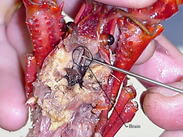 4. Find the green gland located internally just behind each antenna and right under the brain. These structures filter fluid waste from the blood.