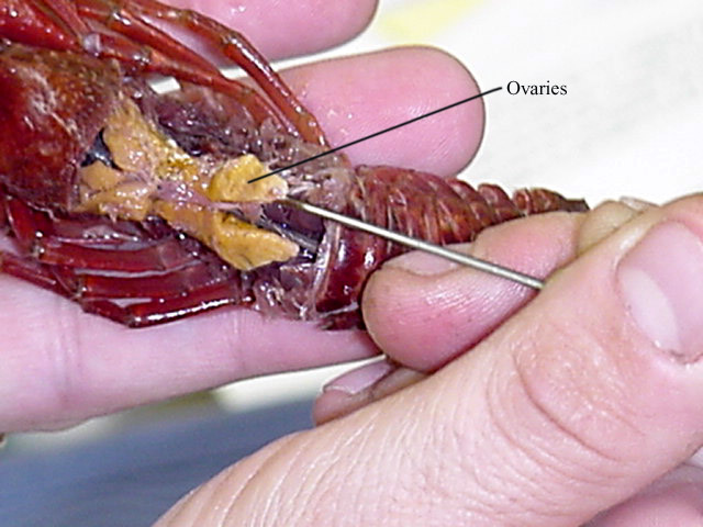 1. Locate the creamy - yellow ovaries in the female crayfish.