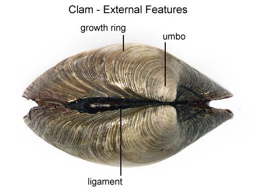 Locate the umbo, the bump at the anterior end of the valve. This is the oldest part of the clam shell. Find the hinge ligament which hinges the valves together and observe the growth rings. The growth rings will indicate the relative age of the clam. Not so much in years, but each additional ring indicates another season of growth. The clam will also use the valves as a way to move quickly. By opening and closing these valves, it can escape predators. It will also use its muscular foot for movement as well.