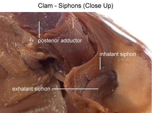 Locate two openings on the posterior end of the clam. The more ventral opening is the incurrent siphon that carries water into the clam and the more dorsal opening is the excurrent siphon where wastes & water leave. Clams will use the siphons to filter out materials in the water for food.