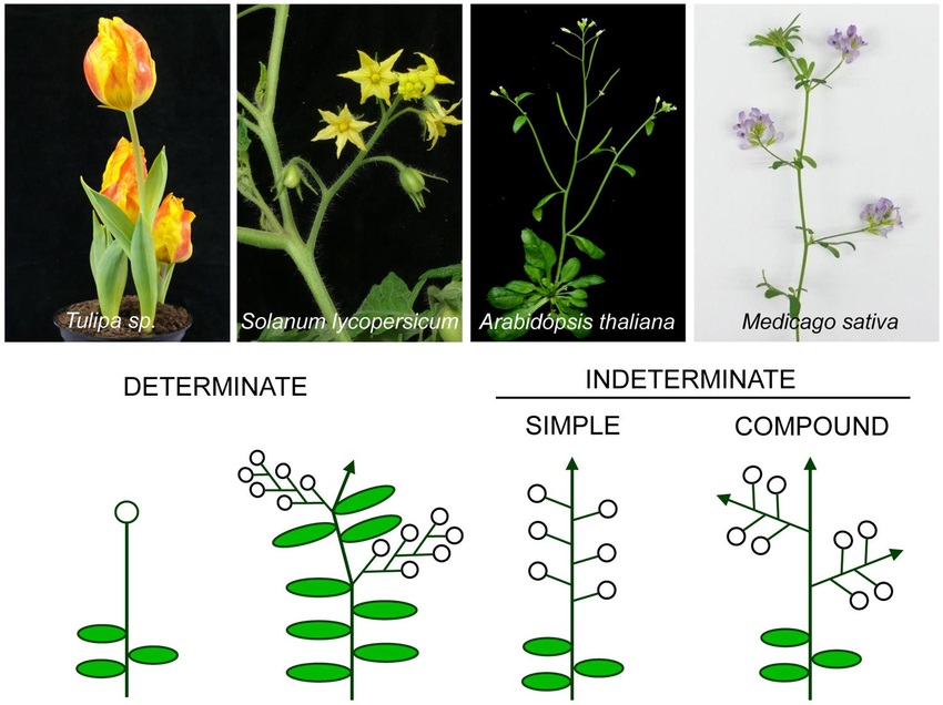The diagram below illustrates different determinant and indeterminate inflorescence types.