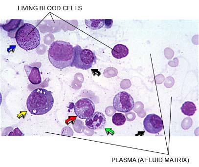 Blood contains a fluid matrix commonly called plasma. This tissue functions to transport substances throughout the body. In this picture, notice the blood cells are suspended in a fluid matrix (called plasma). The red blood cells lack a nucleus and the nuclei of the white blood cells are stained: