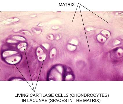 Cartilage has a somewhat firm matrix. It supports, reinforces, and cushions throughout the body. In this picture, notice the lacunae (spaces in the matrix) and the chondrocytes (cartilage cells) within the lacunae. Also notice that the lacunae are not arranged in rings like you see in osseous tissue: