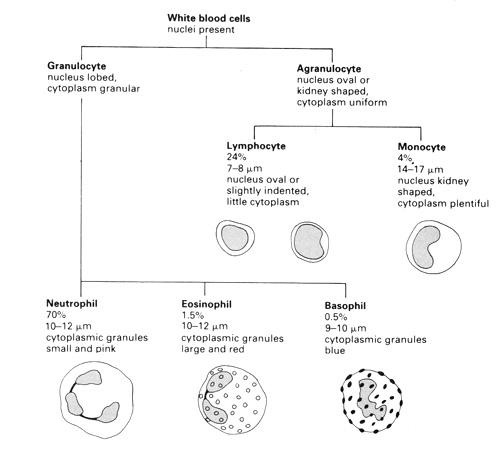 * Distinguish the different classes of white blood cells and the conditions under which each would be expected to dominate.