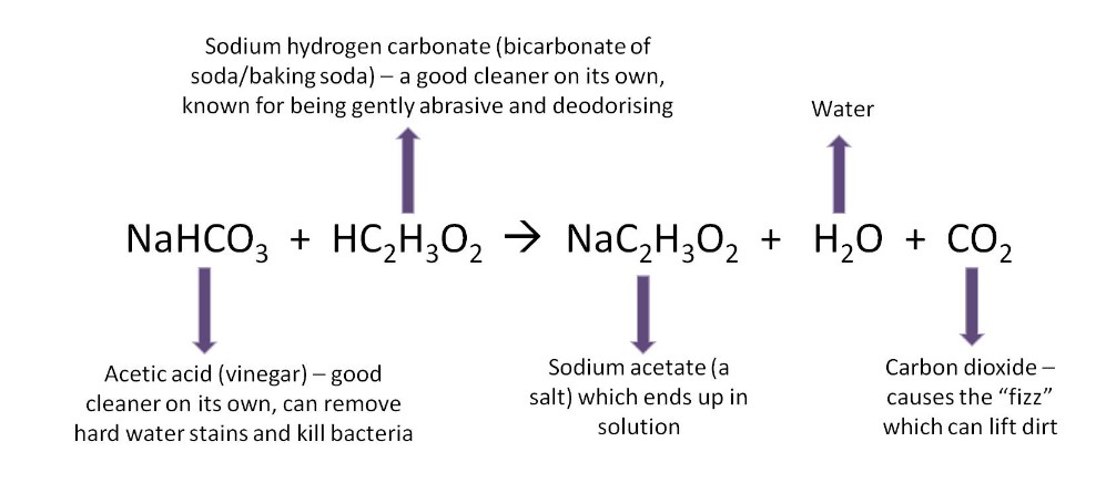 The chemical reaction that occurs when you combine acetic acid and baking soda is shown below: