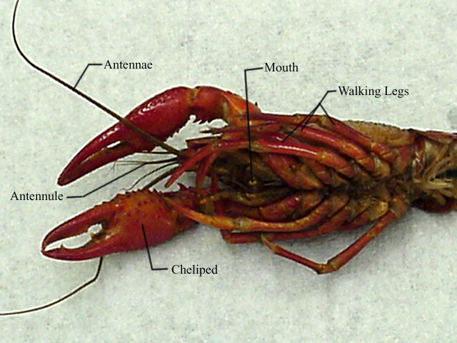 6. On the ventral side, locate the mouth with the mandibles, or true jaws. The mandibles tear the food, and the other appendages detect and hold food during feeding.
