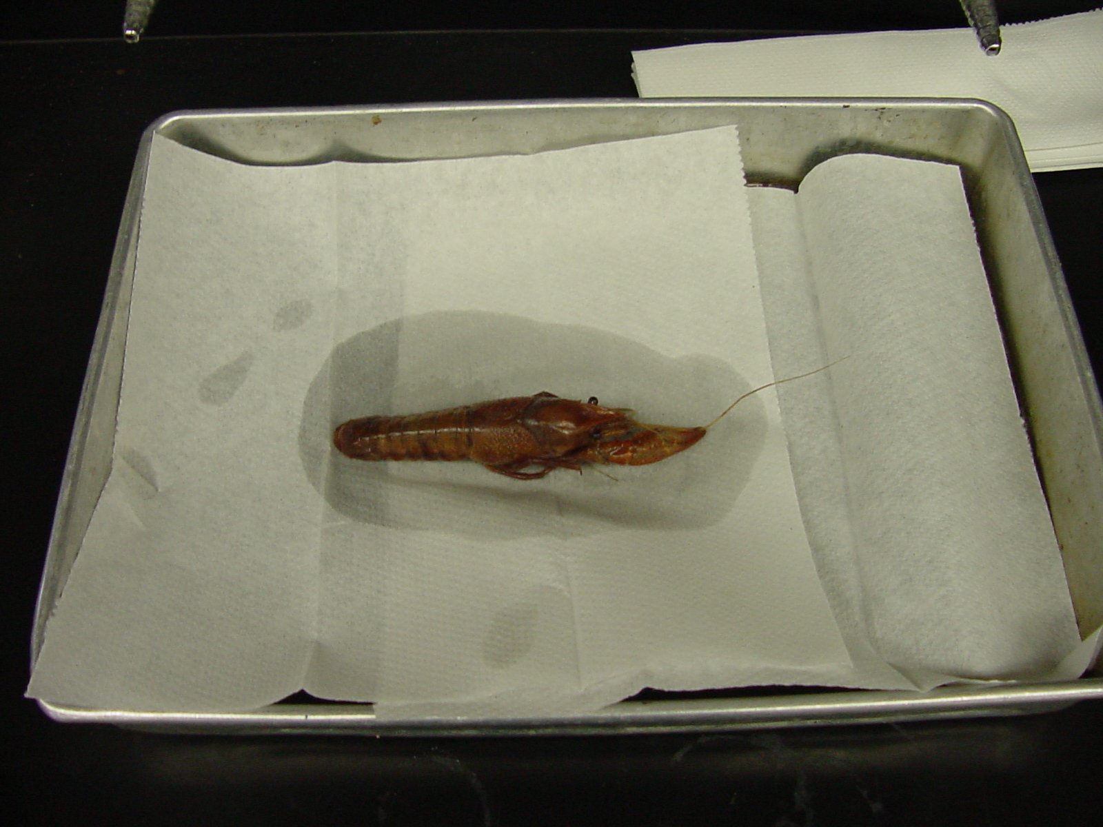 Rinse the crayfish with water then place it in the dissection pan. The crayfish