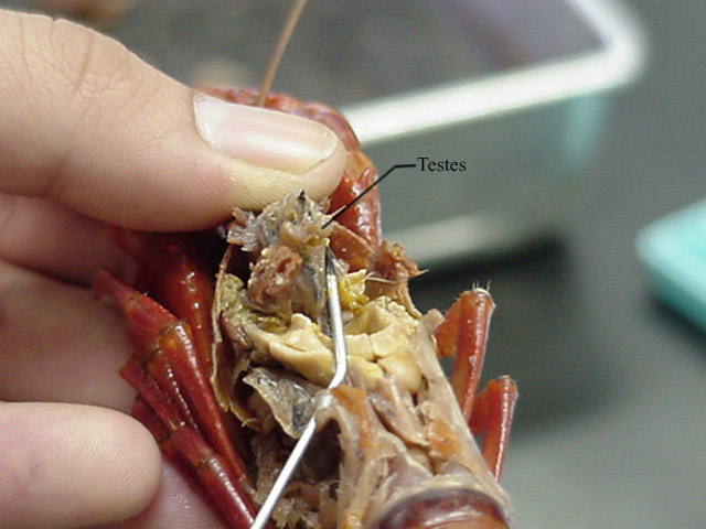 males, the testes.) Locate the testes in the male crayfish. Be cautious