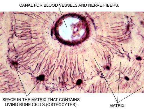Osseous tissue is commonly called bone. It contains a hard calcified matrix. Osseous tissue provides levers for muscles and allows for mineral storage. In this picture, notice the circular patterns formed by the spaces (called lacunae) in the matrix. The osteocytes (bone cells) are housed in the lacunae: